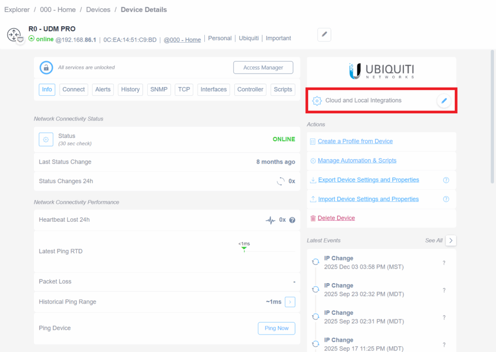 and after entering its device view, you might click on the “Cloud and Local Integrations” pen icon, which you might find under the Ubiquiti Logo:
