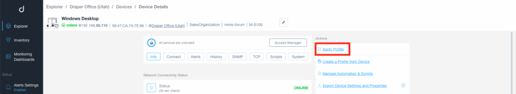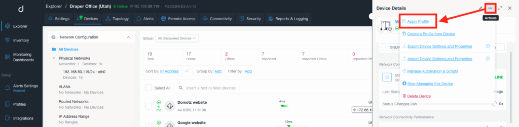 Device Profiles can be applied either from the Profiles menu or directly from the Device Details page.