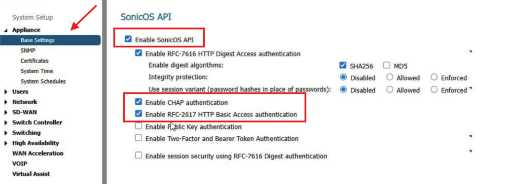 2. In the ‘Audit/SonicOS API’ tab, please make sure that the ‘SonicOS API’, the ‘CHAP authentication, and the ‘RFC-26 HTTP Basic Access authentication’ widgets are enabled, and all the others are ‘disabled’. Then click the ‘Accept’ button.