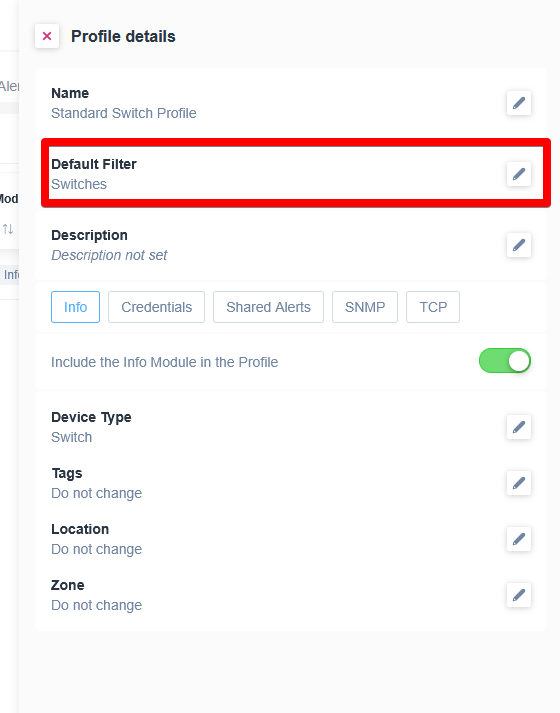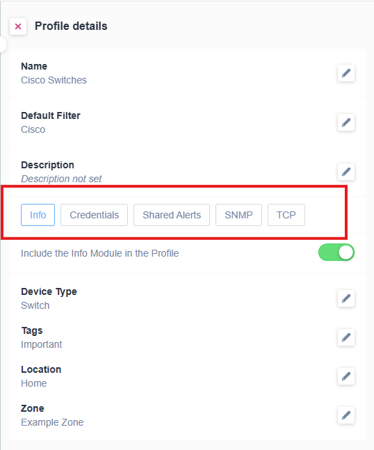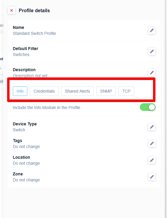 Each profile contains modules which are sections representing specific types of device-level settings that can be configured through Domotz. Modules make it easier to understand and manage what settings a profile controls, and provide a similar UI as seen on the Device Details page for configuration of these settings.