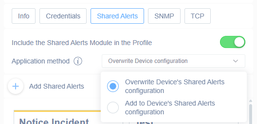 - Shared Alerts: Select shared alert templates to determine notification channels for device status and performance alerts.
