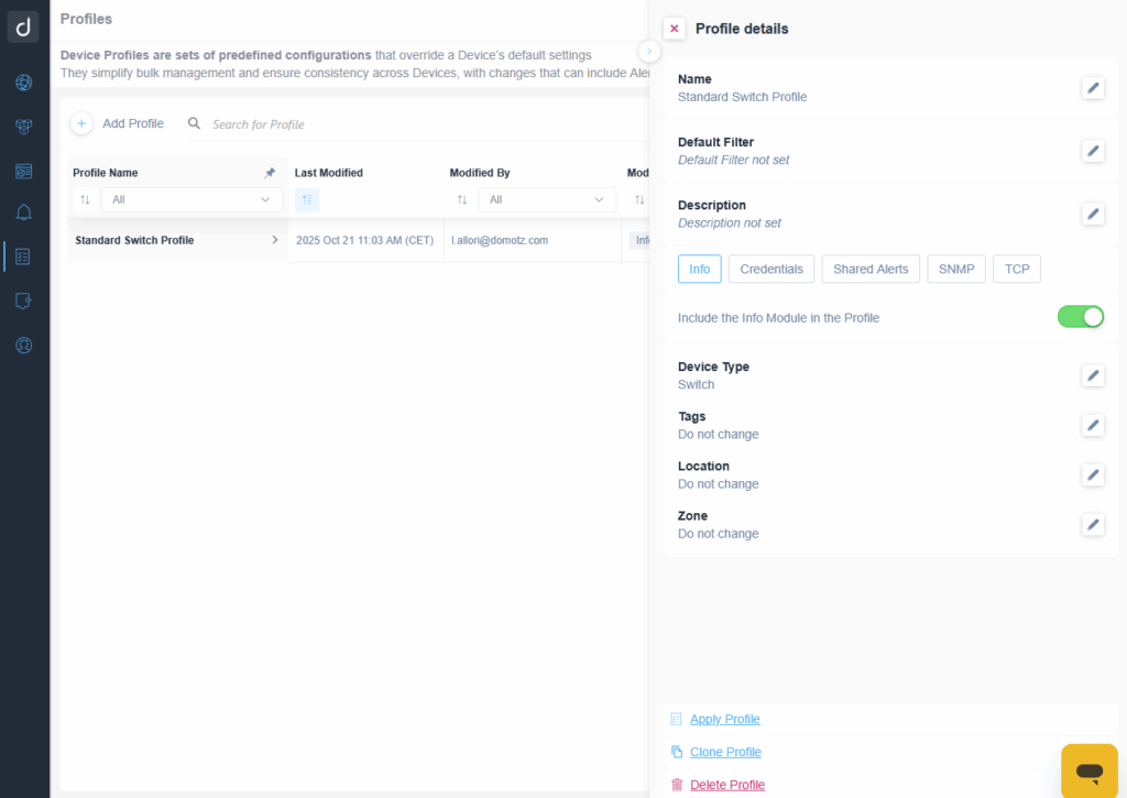 Device Profiles in Domotz make it easy to apply and replicate configuration settings—such as SNMP templates, credentials, and other parameters—across multiple devices in just a few clicks. This feature streamlines onboarding processes, both for new networks and, if you are an MSP, for new customers, by eliminating repetitive manual setup and ensuring consistent configurations throughout your monitored infrastructure.