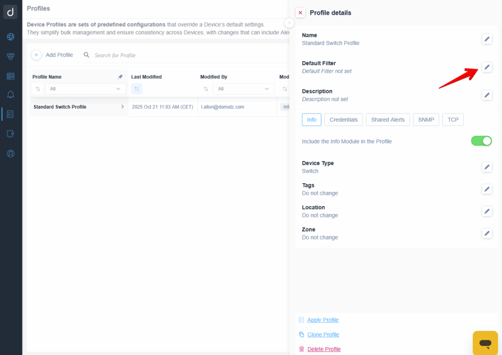 Profiles can be manually applied to selected devices in your account. When applied, each module’s settings are configured on the target devices. Currently, there is no persistent link between a profile and the devices it’s applied to. Changes made to a profile are not automatically propagated; instead, users must manually reapply the profile to update any associated devices.