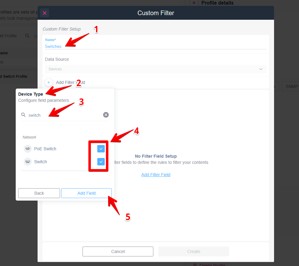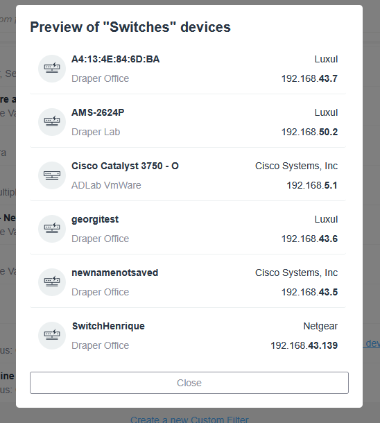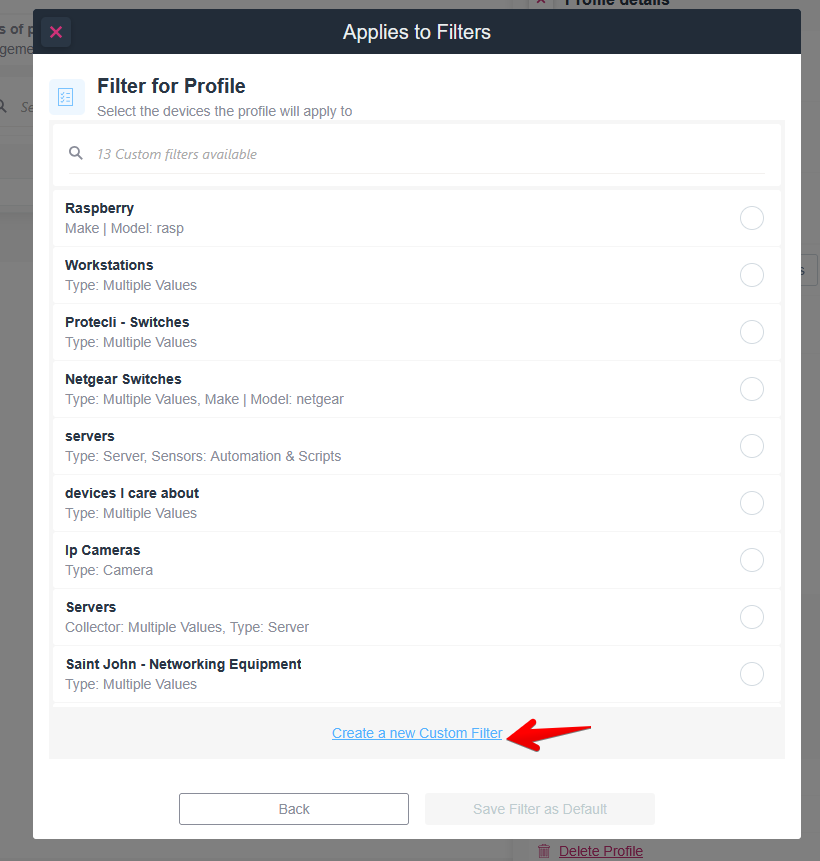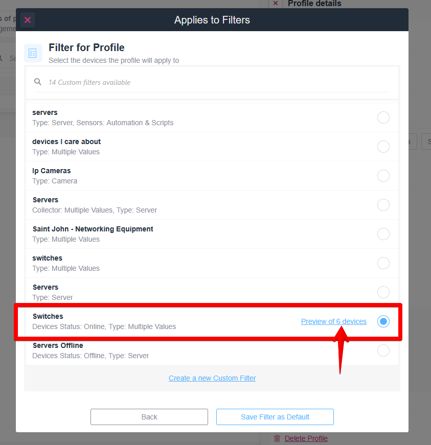Filters can be used to locate or group devices based on properties such as vendor, type, or location. Filters can also be saved as default filters within a profile to identify the set of devices that the profile is intended for. While this does not create a hard link between the profile and those devices, it helps maintain consistency by ensuring that the same device filter is used each time the profile is reapplied.