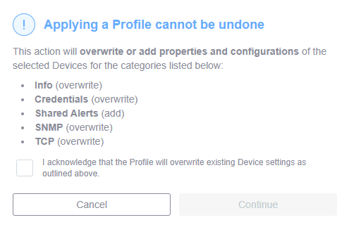 - Additive mode: Adds the new configuration elements defined in the profile to the device without overwriting existing settings. This is useful when extending a device’s configuration while preserving current monitoring or alert rules.