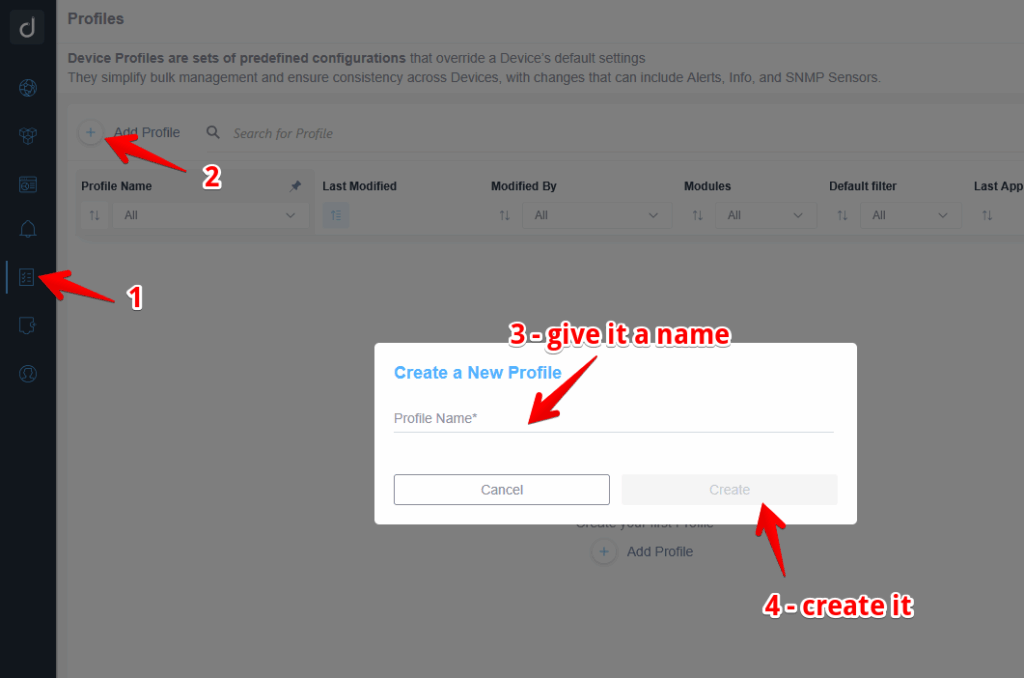 A profile acts as a reusable collection of device-level modules, each representing a specific area of configuration—such as credentials, monitoring settings, or alert definitions. Once created, profiles can be manually applied to one or more devices, ensuring that the same configuration logic is replicated quickly and accurately.
